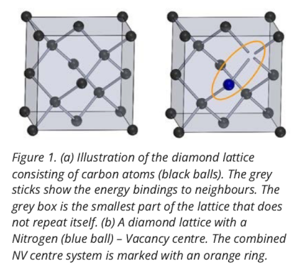 鉆石是由碳原子按照晶格排列的,如圖1所示。沒有雜質(zhì)的鉆石,是無色透明的。如果鉆石里有雜質(zhì)(也就是晶格上的碳原子被雜質(zhì)占據(jù)了),那么鉆石會呈現(xiàn)出一定的顏色。我們用來做磁場探測的鉆石,是在晶格上,有一個碳原子被一個氮原子取代了,同時在這個氮原子緊鄰的晶格上有一個空位,我們稱這種鉆石為氮空位(Nitrogen-Vacancy,NV)色心鉆石。