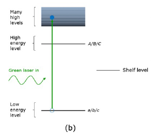 怎么實現(xiàn)呢?我們用一束綠光激光來照射鉆石。當綠光激光器給NV提供外部能量的時候,電子躍遷發(fā)生了。這個時候電子會躍遷到一個能級更高的地方,如下圖b。