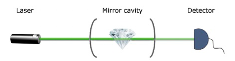 以前沒有采用單一綠光做測試的原因在于綠光輸入與輸出的功率對比很微弱。而隨著腔體技術(shù)的成熟,我們加入一個腔后(如下圖),綠光被鉆石吸收的更多,能夠測得的功率變化就更容易實現(xiàn)一些。