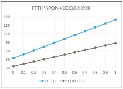 圖1 城區(qū)3000戶模型FTTH與PON+EOC成本比較