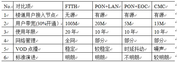 表1 FTTH與其他廣電網(wǎng)絡(luò)技術(shù)的對比