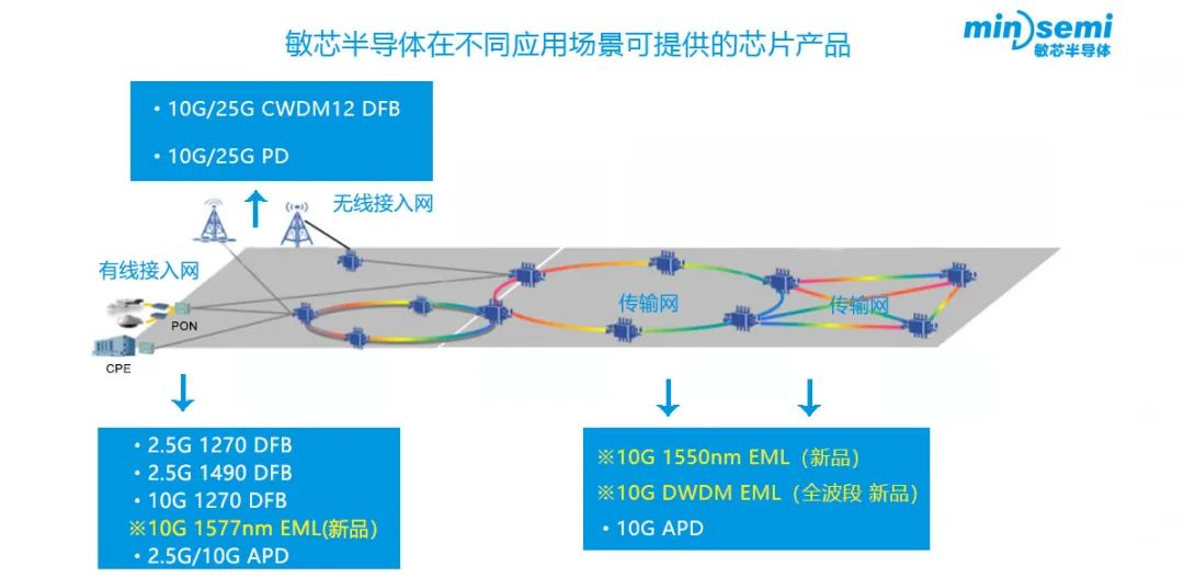 我國(guó)通信網(wǎng)絡(luò)整體架構(gòu)主要包括無(wú)線(xiàn)接入網(wǎng),有線(xiàn)接入網(wǎng)和傳輸網(wǎng)三大應(yīng)用領(lǐng)域。敏芯半導(dǎo)體的EML光芯片產(chǎn)品在10G PON升級(jí)、長(zhǎng)距傳輸及長(zhǎng)距密波分復(fù)用領(lǐng)域?yàn)閺V大客戶(hù)提供全系列解決方案。