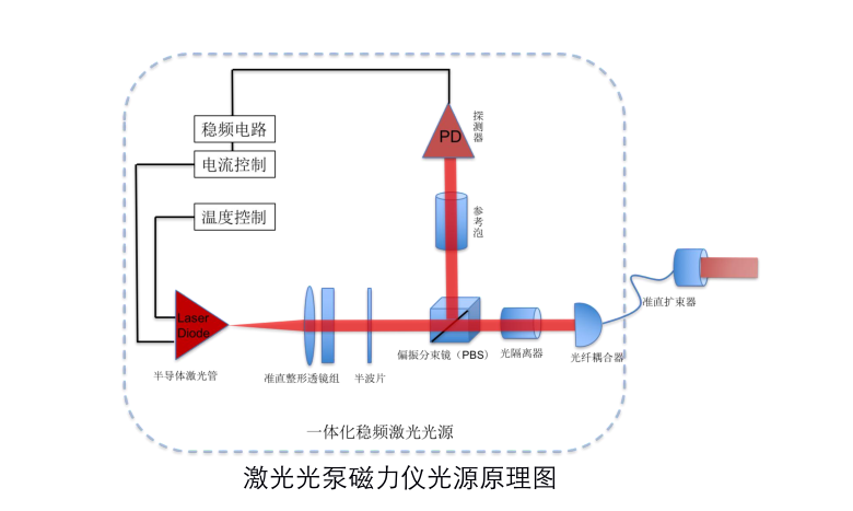 下圖為激光光泵磁力儀的光源原理圖。為了保證磁力儀的檢測靈敏度,激光光泵磁力儀的光源必須要具有很好的頻率穩(wěn)定度,功率穩(wěn)定度以及優(yōu)化設(shè)計的光束直徑。因此,激光光泵磁力儀光源應(yīng)包括準(zhǔn)直整形,偏振分束,飽和吸收穩(wěn)頻光路以及相應(yīng)的高精度電流控制,溫度控制和穩(wěn)頻電路。另外,如果需要將穩(wěn)頻激光光束通過光纖傳輸?shù)酱帕x探頭以避免光源自身磁場對探測結(jié)果的干擾,還需要使用光纖耦合光路及后續(xù)的光纖準(zhǔn)直擴束光路。