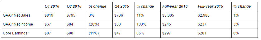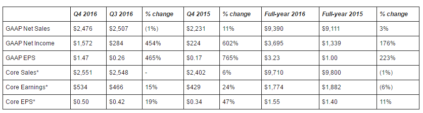 Iccsz訊(編譯:Aiur)2月3日報道,康寧公司在美國時間1月24日公布其2016財年及第四季度業(yè)績,經(jīng)GAAP統(tǒng)計截至12月31日,公司Q416營收達24.8億元(貨幣單位:美元),同比增長11%;凈利潤15.7億元,同比大增602%,EPS為1.47元,同比上升765%。公司2016財年實現(xiàn)營收93.9億元,同比增長3%;凈利潤36.9億元,同比增長176%,EPS3.23元,同比增長223%。