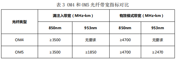 OM5多模光纖,是在OM4光纖基礎上,擴寬了高帶寬通道,其能夠支持850nm~950nm波段的傳輸應用。目前主流的應用,是SWDM4和SR4.2設計。SWDM4是4個短波的波分復用,分別是850nm、880nm、910nm和940nm。這樣在一根光纖可以支撐此前4根并行光纖的業(yè)務。SR4.2是兩波分復用,主要用于單纖雙向技術。OM5能夠與性能好成本低的VCSEL激光器配合,以更好的滿足數(shù)據(jù)中心等短距離通信。下表3是OM4和OM5光纖的主要帶寬指標對比。