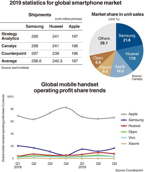在剛剛過去的2019年,誰才是全球智能手機市場的贏家呢?從利潤方面來看,贏家無疑是蘋果。從增長方面來看,那自然是華為。相比之下,三星電子似乎被夾在美國和中國競爭對手之間,因為它既不能獲得比蘋果更多的利潤,也不能比華為增長更多。