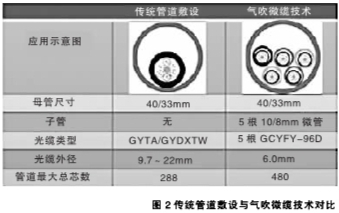 隨著FTTH規(guī)?;l(fā)展,各地均出現(xiàn)管道資源匱乏的情況,節(jié)約管道資源、突破管道瓶頸是當(dāng)前建設(shè)者迫切需要解決的問題。氣吹微纜技術(shù)是當(dāng)前最佳解決方案之一。以一根40/33的子管為例,如圖2所示,采用氣吹微纜技術(shù),管道的最大總芯數(shù)可以達(dá)到480芯,極大地提高了管道利用率。此外,技術(shù)施工速度快,布放靈活,不僅節(jié)約了建設(shè)成本,還在短時(shí)間內(nèi)緩解了管道資源緊張的狀況,為以后的管道擴(kuò)容提供了彈性空間。