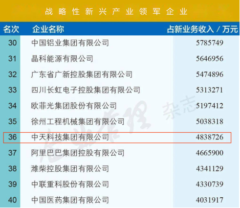 ICC訊 近期,中國企業(yè)聯(lián)合會、中國企業(yè)家協(xié)會發(fā)布《2020中國戰(zhàn)略性新興產(chǎn)業(yè)領軍企業(yè)100強》榜單,中天科技憑借出色的戰(zhàn)新產(chǎn)業(yè)創(chuàng)新成績,榮登第36位。