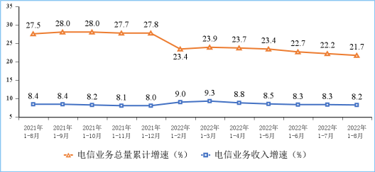 電信業(yè)務收入穩(wěn)步增長,電信業(yè)務總量保持兩位數(shù)增幅。1-8月份,電信業(yè)務收入累計完成10721億元,同比增長8.2%。按照上年不變價計算的電信業(yè)務總量同比增長21.7%。