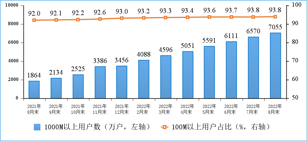 固定寬帶接入用戶規(guī)模穩(wěn)步增長,千兆用戶數(shù)持續(xù)擴大。截至8月末,三家基礎電信企業(yè)的固定互聯(lián)網(wǎng)寬帶接入用戶總數(shù)達5.71億戶,比上年末凈增3523萬戶。其中,100Mbps及以上接入速率的固定互聯(lián)網(wǎng)寬帶接入用戶達5.36億戶,占總用戶數(shù)的93.8%,占比較上年末提升0.8個百分點;1000Mbps及以上接入速率的固定互聯(lián)網(wǎng)寬帶接入用戶達7055萬戶,比上年末凈增3596萬戶,占總用戶數(shù)的12.4%。