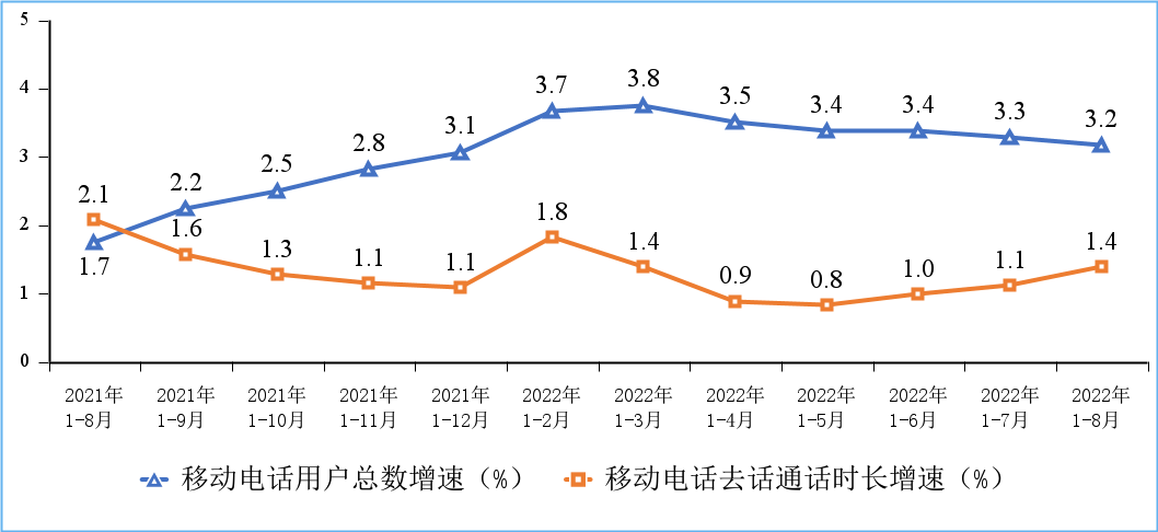 移動電話通話量低速增長,移動短信業(yè)務收入增速小幅提升。1-8月份,移動電話去話通話時長完成1.52萬億分鐘,同比增長1.4%;固定電話主叫通話時長完成557.4億分鐘,同比下降11.1%。1-8月份,全國移動短信業(yè)務量同比增長1.7%,移動短信業(yè)務收入同比增長1.5%,增速較1-7月份分別回落0.4個和提升0.7個百分點。