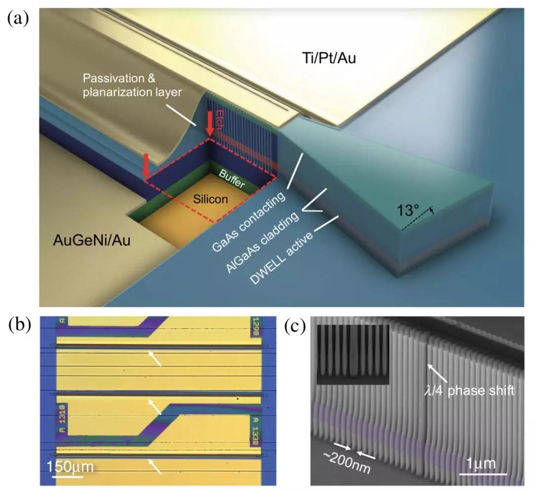 1 硅基DFB激光器示意圖。(a) 激光器剖面圖,展示了外延層結(jié)構(gòu)、光波導(dǎo)結(jié)構(gòu)和輸出耦合器;(b) 激光器陣列光學(xué)顯微鏡照片;(c)側(cè)壁布拉格光柵的電子顯微鏡照片,展示了超高寬深比的一階光柵。