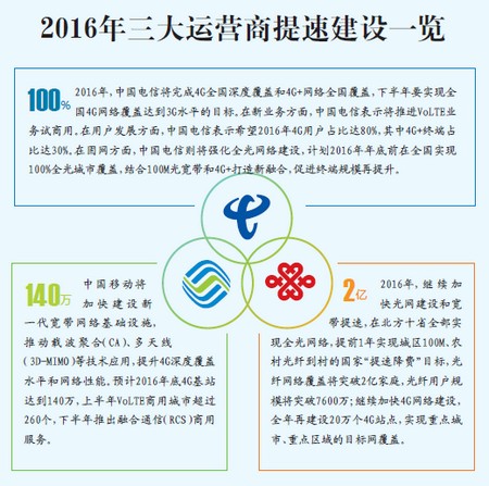 根據(jù)三大運營商各家的2016年的規(guī)劃,高速光纖寬帶網(wǎng)絡和4G+是有線端和無線端的兩個投資重點。