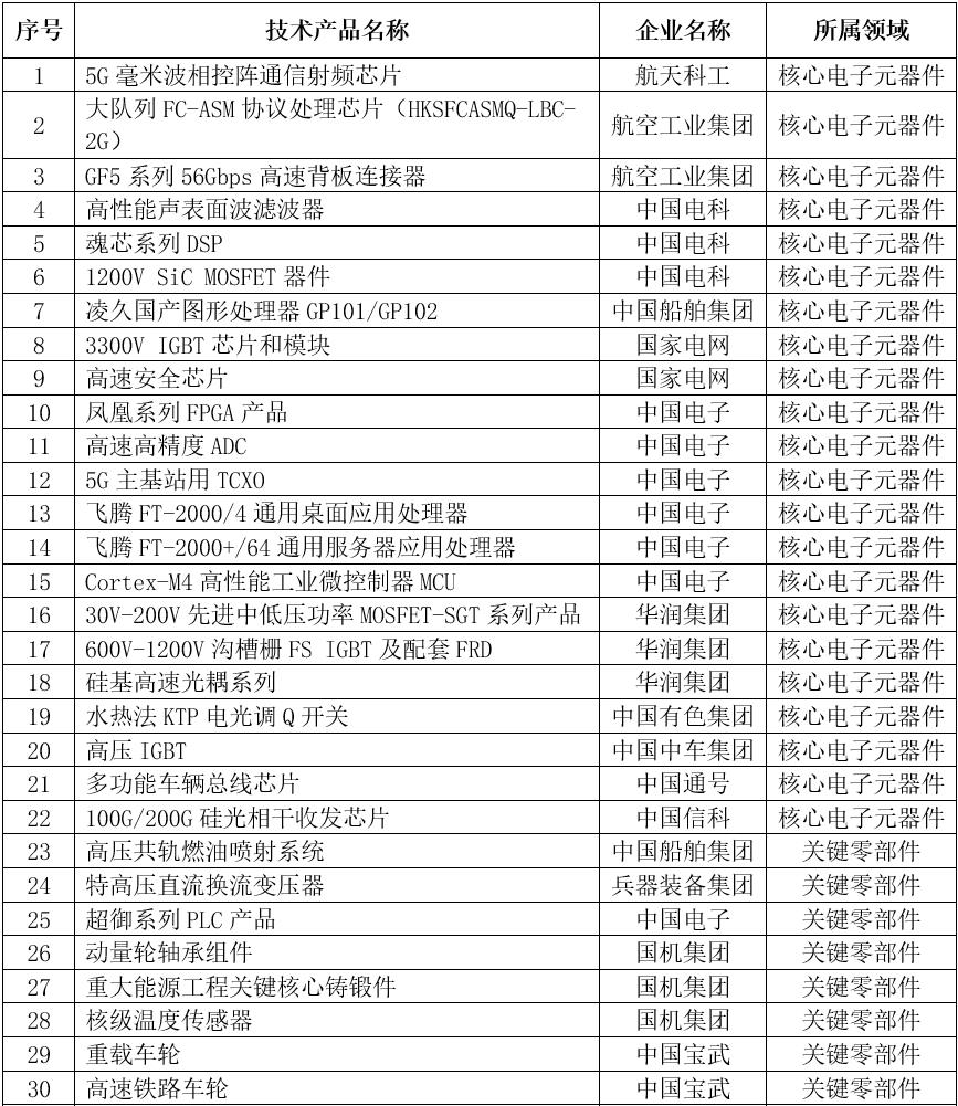 其中,在核心電子元器件領(lǐng)域有魂芯系列DSP、高速安全芯片、高速高精度ADC、高壓IGBT等,在基礎(chǔ)軟件領(lǐng)域有“九天”人工智能平臺、麒麟操作系統(tǒng)、BIMBase建模軟件等,在關(guān)鍵零部件領(lǐng)域有特高壓直流換流變壓器、核級溫度傳感器、重載車輪、軌道交通驅(qū)動齒輪裝置等,在關(guān)鍵材料領(lǐng)域有納米氣凝膠復(fù)合材料、對位芳綸、超細(xì)高純鍺粉、鉭靶材、T800級高性能碳纖維等,在先進(jìn)工藝領(lǐng)域有芳烴成套技術(shù)、集成電路制造BCD工藝、飛機(jī)內(nèi)飾件3D打印技術(shù)、電子束處理工業(yè)廢水技術(shù)等,在高端裝備領(lǐng)域有高動態(tài)寬頻帶五軸飛行仿真轉(zhuǎn)臺、重型H型鋼精軋機(jī)組、氫燃料電池發(fā)動機(jī)、特種型鋼萬能軋機(jī)等。