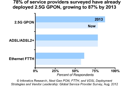 * 78%受訪的運(yùn)營(yíng)商已經(jīng)部署了2.5G GPON,這個(gè)比例到2013年會(huì)上升至87%。