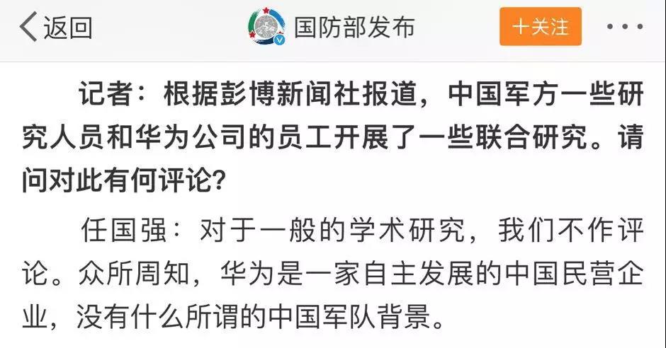 在27日國防部例行記者會上,針對外媒有關(guān)中國軍方研究人員和華為公司共同研發(fā)的報道,國防部新聞發(fā)言人任國強(qiáng)表示,對于一般學(xué)術(shù)研究我們不做評論,“眾所周知,華為公司是一家自主發(fā)展的民營企業(yè),沒有所謂的軍方背景?!?