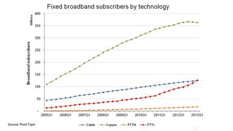 Point Topic相關負責人表示,對于全球網民來說,銅線(電話線)仍然是主導性的寬帶網絡,不過寬帶技術已經出現了遷移的趨勢,隨著消費者愿意為更高速的寬帶支付費用,光纖寬帶和光纖混合同軸的方式越來越普及。