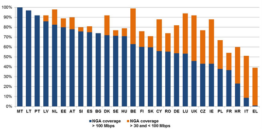 歐洲各國(guó)Superfast和Ultrafast排名:30M和100M下一代接入覆蓋(截至2015年底)