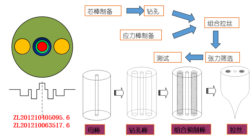 細(xì)徑保偏光纖的工藝路線如下圖所示,它包含芯棒制備和應(yīng)力棒制備兩個(gè)相對(duì)獨(dú)立又互相聯(lián)系的子光棒工藝,通過(guò)鉆孔技術(shù)將二者融合在一起從而形成保偏光纖預(yù)制棒,期間通過(guò)獨(dú)特的波導(dǎo)結(jié)構(gòu)設(shè)計(jì)和光纖涂層結(jié)構(gòu)設(shè)計(jì)然后拉制成細(xì)徑保偏光纖,從而制造出了高性能的135微米細(xì)徑保偏光纖。