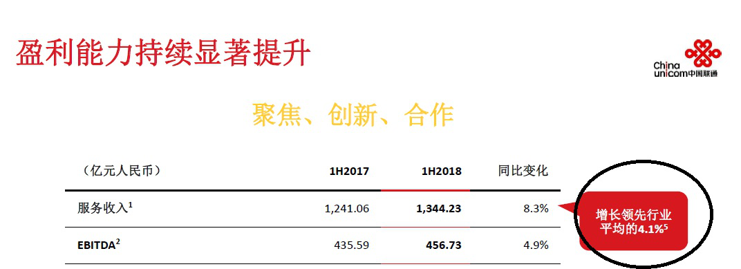 中國聯(lián)通遙相呼應(yīng),在推介材料第6頁就以添加紅色備注框的顯眼形式突出自己上半年1,344億元的服務(wù)收入同比增長8.3%,顯著地“領(lǐng)先行業(yè)平均的4.1%”。