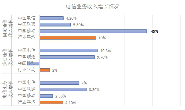 具體到三大運(yùn)營商的貢獻(xiàn)來看,中國聯(lián)通和中國電信的業(yè)務(wù)收入增長表現(xiàn)確實(shí)搶眼,移動業(yè)務(wù)和固定業(yè)務(wù)增長實(shí)現(xiàn)了雙豐收。而中國移動雖然在固定通信業(yè)務(wù)收入上實(shí)現(xiàn)了49%的高速增長,但其移動通信業(yè)務(wù)收入?yún)s下滑了2%。