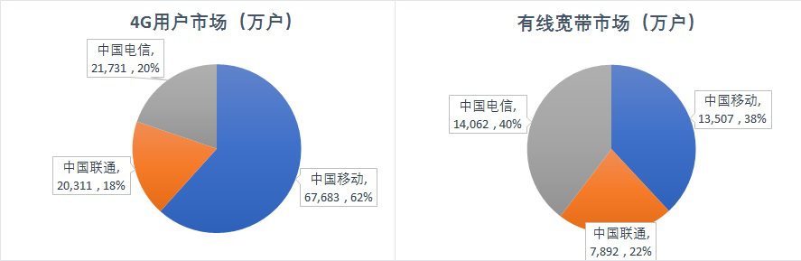 從三大運(yùn)營商4G用戶和有線寬帶用戶市場結(jié)構(gòu)來看,中國移動不僅在4G用戶市場份額上保持著穩(wěn)固的領(lǐng)先優(yōu)勢,而且在有線寬帶用戶市場上距離取代中國電信的領(lǐng)先位置也僅差一步之遙。