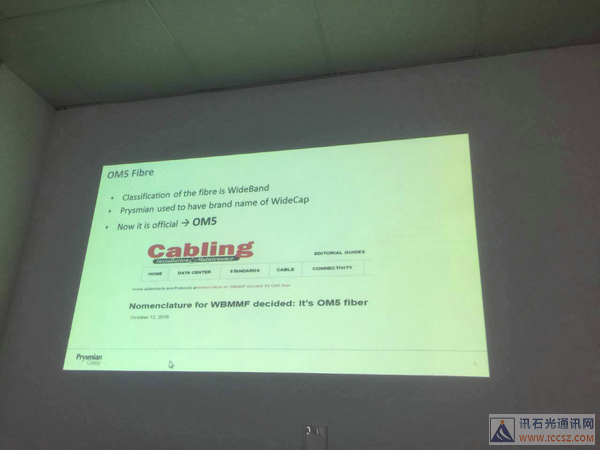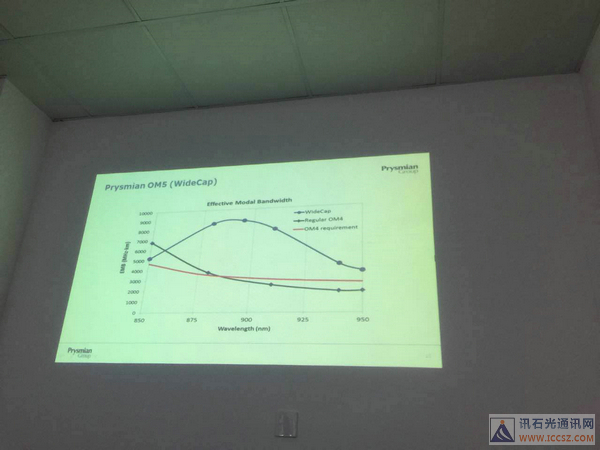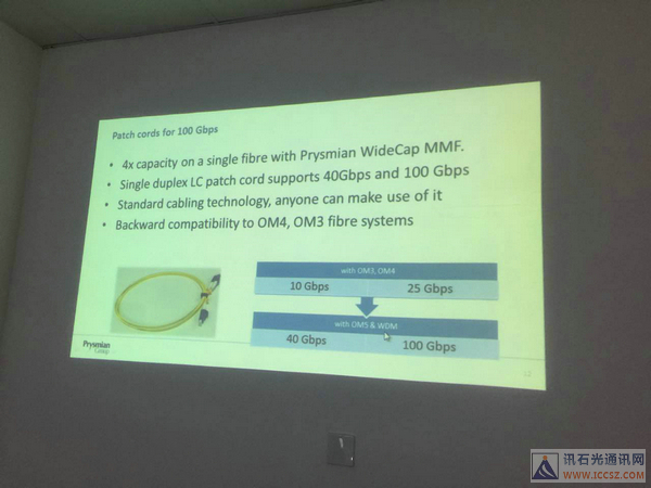 另一款新品是Om5多模光纖,其標(biāo)準(zhǔn)是利用波分復(fù)用技術(shù)可在一根光纖上實(shí)現(xiàn)4倍OM4的傳輸容量,它在空間節(jié)省和高速容量上有很大的優(yōu)勢。這款2016年推出的新產(chǎn)品OM5適用850~950nm,現(xiàn)在已經(jīng)進(jìn)入量產(chǎn)階段。OM5光纖的推出對于數(shù)據(jù)中心的建設(shè)將有巨大的促進(jìn)作用,可以大大簡約空間。