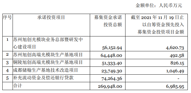 根據(jù)本公司于 2021 年 8 月 25 日公告的《中際旭創(chuàng)股份有限公司向特定對象發(fā)行 A 股股票募集說明書》,計劃對 5 個具體項(xiàng)目使用募集資金計人民幣 269,948.00 萬元。截至 2021 年 11 月 19 日止,本公司以自籌資金預(yù)先投入募集資金投資項(xiàng)目款項(xiàng)計人民幣 6,985.95 萬元。具體運(yùn)用情況如下: