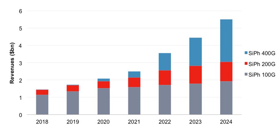 圖1:2018-2024年100G、200G和400G收發(fā)器的SiPh部分收入。資料來源:Ovum。
