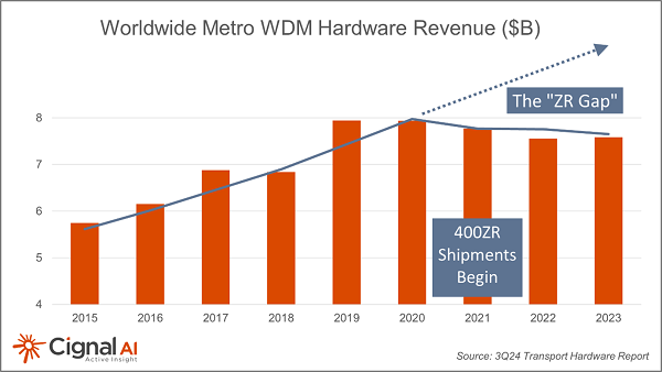 “光傳輸行業(yè)正面對多個增長挑戰(zhàn),但云資本支出的增長為市場提供了重要的機(jī)遇。”Cignal AI首席分析師Kyle Hollasch表示,“網(wǎng)絡(luò)運營商正在將資金從傳統(tǒng)的城域光傳輸系統(tǒng)轉(zhuǎn)向基于400ZR的IP-over-DWDM解決方案,這顛覆了歷史上的支出模式。如今的增長點來自長途W(wǎng)DM,這對于連接超大規(guī)模數(shù)據(jù)中心投資數(shù)十億美元的AI數(shù)據(jù)中心至關(guān)重要?!?