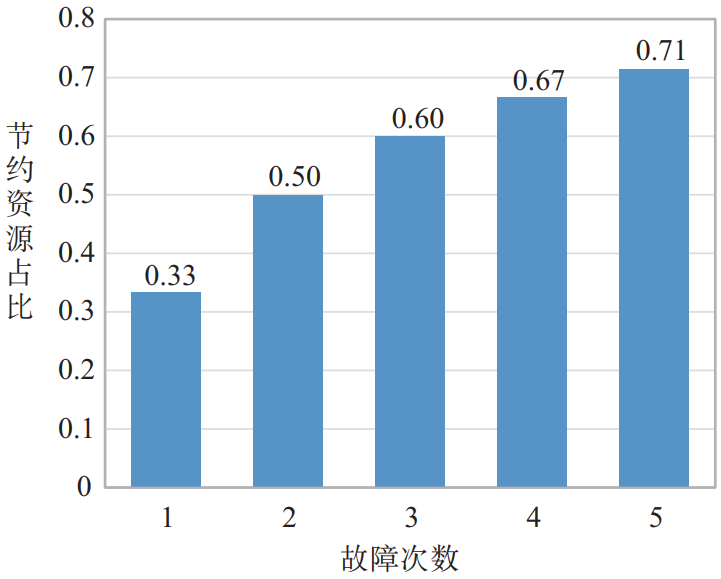 傳統(tǒng)的1+1保護(hù)在出現(xiàn)故障后,一方面需要恢復(fù)業(yè)務(wù),另一方面需要重新計算并占用端到端資源,在多次故障的情況下,占用的冗余資源成倍增長。在引入光層恢復(fù)后,當(dāng)工作路徑發(fā)生故障時,首先通過電層保護(hù)實現(xiàn)快速倒換,之后在原工作路徑進(jìn)行光層恢復(fù)作為備用路徑,無需重復(fù)占用端到端資源。在多次故障情況下,通過光電協(xié)同實現(xiàn)永久1+1相對于傳統(tǒng)永久1+1保護(hù),節(jié)約資源占比如圖9所示。