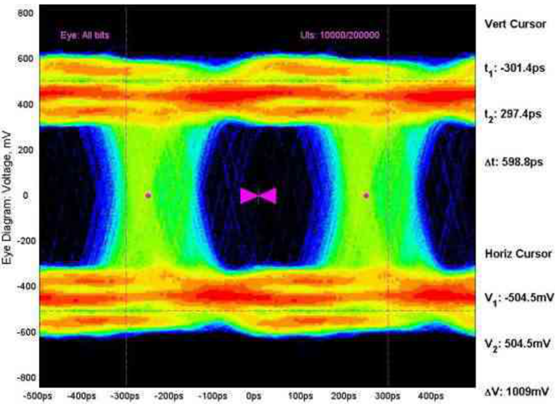 這種架構(gòu)在原理上是可行的,但是在實(shí)際測(cè)試中發(fā)現(xiàn)使用芯片時(shí)鐘得到的TDECQ可能比使用外置CRU的反而更好。造成這個(gè)差異的主要原因是協(xié)議規(guī)定CRU中PLL帶寬只有10Mhz,會(huì)過(guò)濾掉光信號(hào)中的高頻抖動(dòng)成分。而芯片時(shí)鐘輸出可以做到和光信號(hào)完全同步。在光信號(hào)本身存在較大高頻抖動(dòng)分量時(shí),用芯片時(shí)鐘反而獲得更好的TDECQ。以下面三幅眼圖對(duì)比為例,同一個(gè)1Gbps NRZ信號(hào)在CRU PLL帶寬為635kHz,1500kHz和5000kHz時(shí)的眼圖存在明顯差異。造成差異的原因就是這個(gè)1Gbps信號(hào)抖動(dòng)頻譜中包含了719kHz和1383kHz這兩個(gè)高頻分量。需要注意的是最終用戶一般都會(huì)依據(jù)IEEE協(xié)議規(guī)范使用CRU測(cè)TDECQ,在產(chǎn)線使用芯片時(shí)鐘輸出做為觸發(fā)可能會(huì)導(dǎo)致不符合規(guī)范要求的產(chǎn)品流到客戶處。