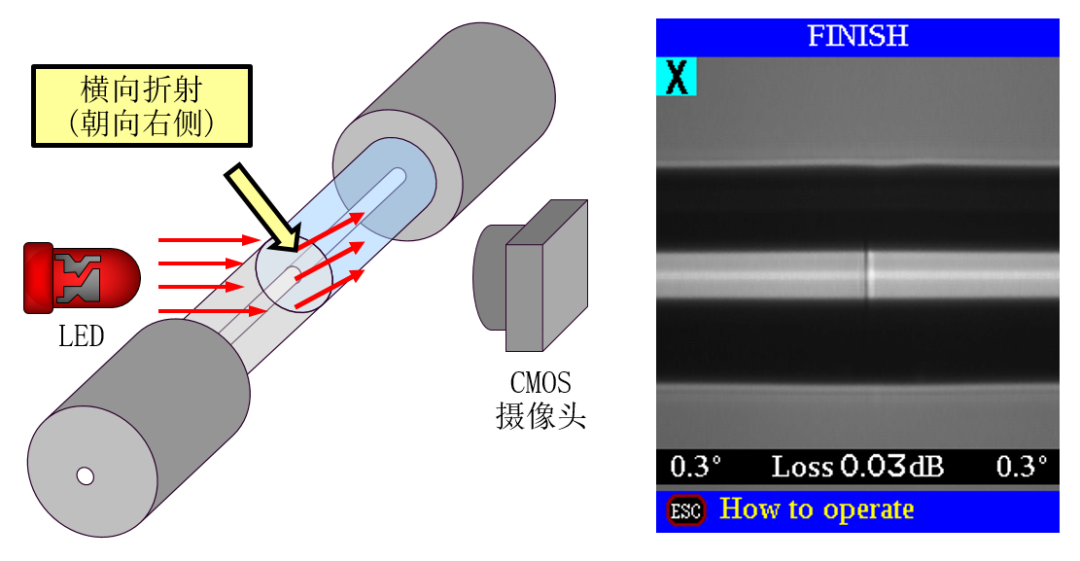 線條或者陰影是由光纖熔接機LED照明光在發(fā)生橫向折射之后產(chǎn)生的。照明光會朝著具有較高折射率光纖的方向(或者是光纖內(nèi)的特性)發(fā)生折射。