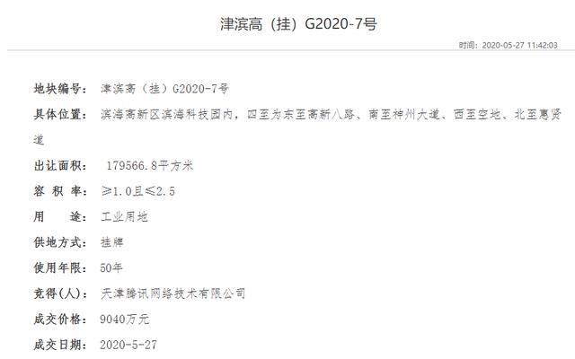 天津土地交易中心公告顯示,該地塊于2020年4月28日掛牌出讓。地塊四至為東至高新八路、南至神州大道、西至空地、北至惠賢道?,F(xiàn)狀已達(dá)到場(chǎng)清地平。出讓土地面積約18萬(wàn)平方米,50年工業(yè)用地,容積率要求不低于1.0且不高于2.5,建筑系數(shù)≥35%,建筑密度≤55%,綠地率20%。投資強(qiáng)度不低于6210萬(wàn)元/公頃。最終騰訊以9040萬(wàn)元底價(jià)成功拿地。