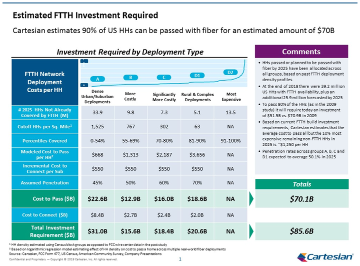 隨著光纖部署成本的下降以及向農(nóng)村地區(qū)的推出變得更加可行,而Cartesian在2009年最后一次看到這個(gè)問題時(shí),分析師和光纖寬帶協(xié)會(huì)認(rèn)為,在接下來的10年中,有90%的家庭將會(huì)部署FTTH是一個(gè)可實(shí)現(xiàn)的目標(biāo),每個(gè)家庭平均成本1250美元(見圖表)。當(dāng)然,主要問題是700億美元的來源。光纖寬帶協(xié)會(huì)指出“創(chuàng)新部署模式,政府努力降低對(duì)重要基礎(chǔ)設(shè)施的訪問障礙,并有效地提供政府支持”作為可能創(chuàng)造所需投資環(huán)境的因素。