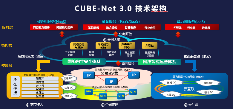 CUBE-Net 3.0將網(wǎng)絡(luò)的發(fā)展愿景定位為建設(shè)新一代數(shù)字信息基礎(chǔ)設(shè)施,構(gòu)建“算網(wǎng)為基、數(shù)智為核、低碳集約、安全可控”的算網(wǎng)一體底座,將運(yùn)營商的 “敏捷聯(lián)接”服務(wù)升級(jí)到“聯(lián)接+感知+計(jì)算+智能”的 “智能融合”服務(wù)。在網(wǎng)絡(luò)SDN/NFV和云化轉(zhuǎn)型的基礎(chǔ)上,融入云原生、邊緣計(jì)算、人工智能、區(qū)塊鏈、內(nèi)生安全、確定性服務(wù)和IPv6+等新技術(shù)元素,強(qiáng)化不同技術(shù)和產(chǎn)業(yè)要素的深度融合。