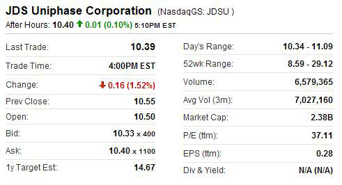 JDSU的股價(jià)目標(biāo)定為14.75美元。8日收盤該公司股價(jià)收?qǐng)?bào)10.55美元。