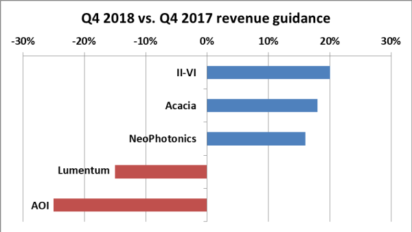 光器件商們對2018年第四季度的財測也呈現(xiàn)這種情況,一些預計強勁增長,一些表示不盡人意。II-VI繼續(xù)受益于對ROADM和980nm泵浦激光器的強勁需求,預計將實現(xiàn)20%的同比增長。Acacia和NeoPhotonics則在新的CFP2和600G產(chǎn)品(Acacia)需求以及來自華為銷售的增長(NeoPhotonics)的驅動下,預計將實現(xiàn)約15%的增長。Lumentum之前預計增長14%,但由于一家大型電子產(chǎn)品客戶(即Apple)第四季度對VCSEL陣列的需求下滑,不得不將其財測改為下滑15%。AOI仍在努力解決限制了其產(chǎn)能的質量問題。