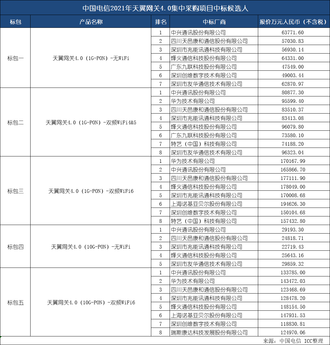 ICC訊 (編輯:Aiur)5月22日,中國電信發(fā)布2021年天翼網(wǎng)關(guān)4.0集中采購項(xiàng)目中標(biāo)候選人公示,本次項(xiàng)目分為5個標(biāo)包,采購天翼網(wǎng)關(guān)4.0設(shè)備(無WIFI和雙頻Wifi6的1G-PON/10G-PON),中興通訊、天邑康和、華為和九聯(lián)科技等廠商中標(biāo),具體中標(biāo)候選人和報價如下: