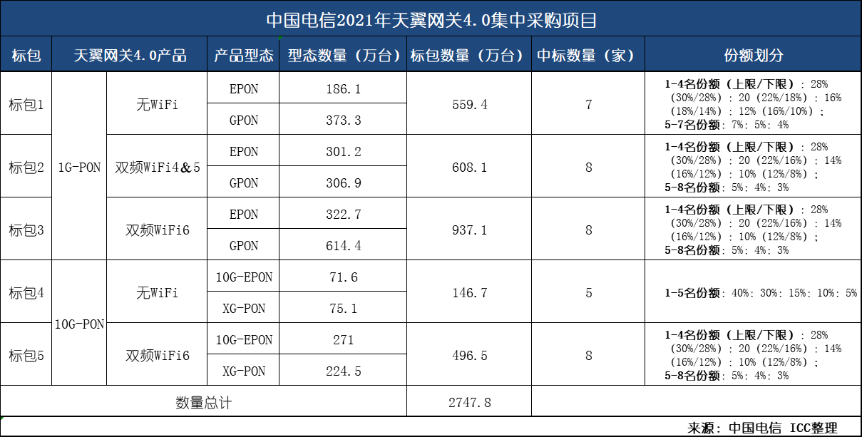 據(jù)了解,中國電信2021年天翼網(wǎng)關(guān)4.0集采規(guī)模約2747.8萬臺,其中1G-PON設(shè)備方面,無WiFi類型數(shù)量為559.4萬臺(EPON形態(tài)186.1萬臺、GPON形態(tài)373.3萬臺),雙頻WiFi4&5類型數(shù)量為609.1萬臺(EPON形態(tài)301.2萬臺、GPON形態(tài)306.9萬臺),雙頻WiFi6類型數(shù)量為937.1萬臺(EPON形態(tài)322.7萬臺、GPON形態(tài)614.4萬)。