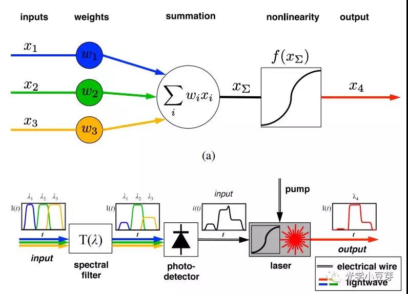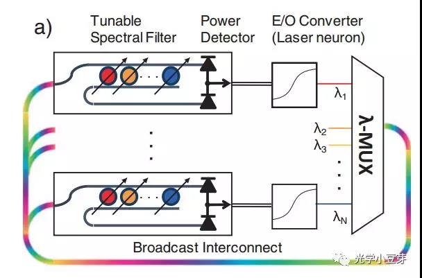 Luminous公司的CTO Mitchell Nahmias畢業(yè)于Princeton大學(xué),其PhD期間的主要工作就是光學(xué)AI芯片的研究。他們所采用的方案不是基于Mach-Zehnder干涉器,而是稱為Broadcast and Weight方案(以下簡(jiǎn)稱B&W方案)。其原理框架圖如下圖所示,