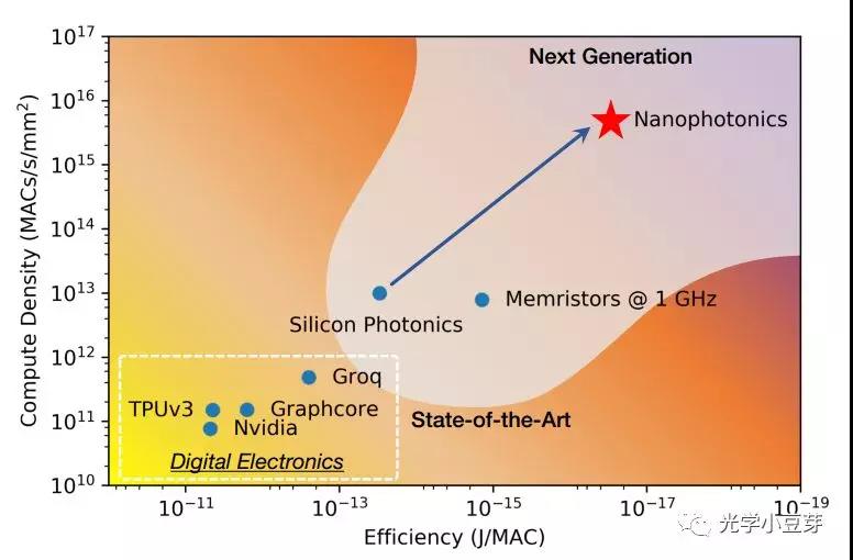 Luminous Computting公司的官網(wǎng)https://www.luminouscomputing.com/ 非常簡(jiǎn)單,只有一頁(yè)文字介紹 。最近光學(xué)AI芯片的進(jìn)展比較多,光學(xué)實(shí)現(xiàn)AI的主要優(yōu)勢(shì)是速度快和能耗小。下圖比較了光學(xué)與電學(xué)AI芯片的能耗與計(jì)算密度。光學(xué)AI芯片初創(chuàng)公司都得到了科技巨頭公司的投資,這在一定程度上論證了該方案的優(yōu)勢(shì)與可行性。小豆芽會(huì)持續(xù)關(guān)注這一領(lǐng)域的進(jìn)展。