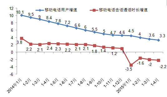 從圖二可以看出,我國(guó)的語(yǔ)音通話也已進(jìn)入下降通道。2015年1-4月,全國(guó)移動(dòng)電話通話量同比下滑1.5個(gè)百分點(diǎn),其中移動(dòng)電話去話通話時(shí)長(zhǎng)完成9374.0億分鐘,同比下降2.2%,比1-3月降幅擴(kuò)大0.2個(gè)百分點(diǎn)。