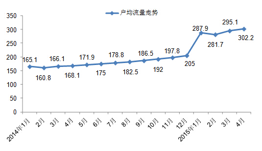 從圖三,則可以看出,我國(guó)移動(dòng)用戶戶均使用流量在經(jīng)歷快速上漲。2015年4月,月戶均移動(dòng)互聯(lián)網(wǎng)接入流量達(dá)到302.2M,同比增長(zhǎng)79.7%。