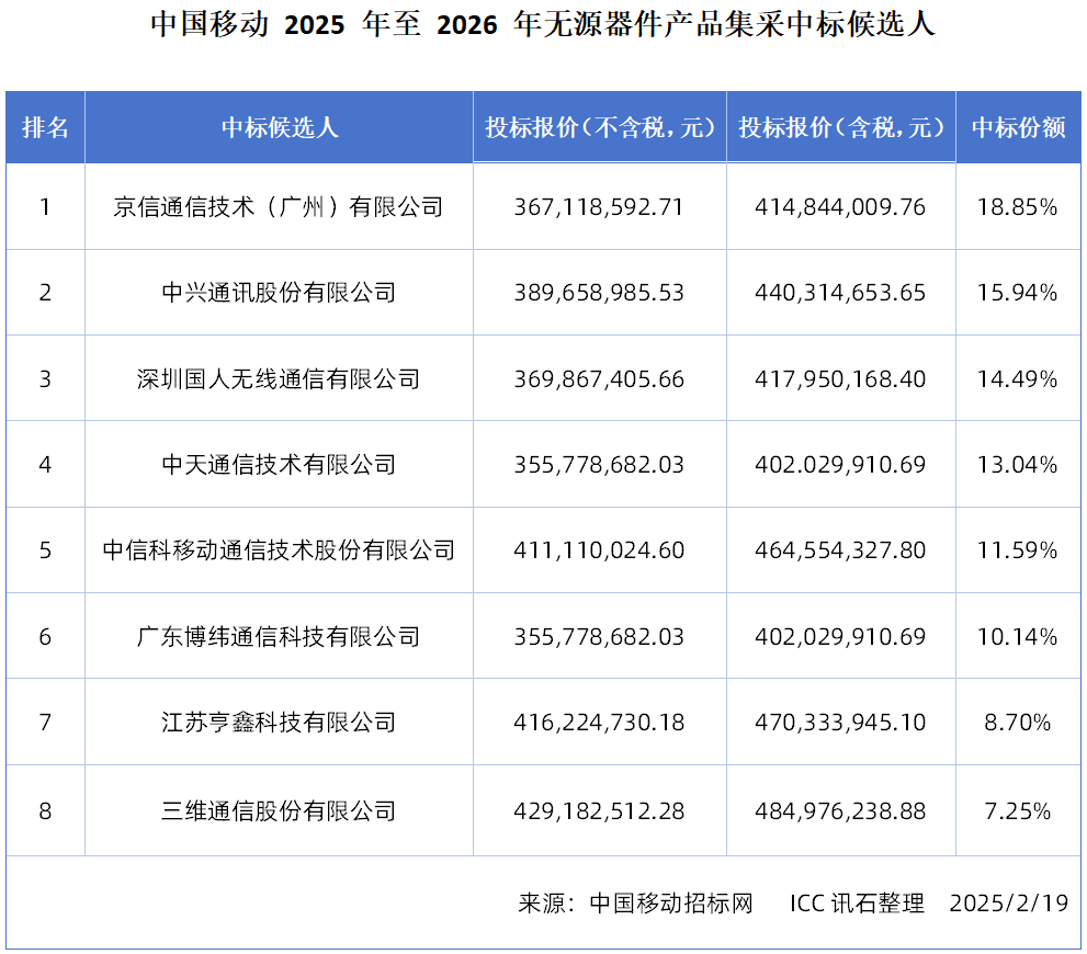 ICC訊 日前,中國(guó)移動(dòng)于官網(wǎng)公示了2025年至2026年無源器件產(chǎn)品集中采購(gòu)項(xiàng)目的中標(biāo)候選人。本次集采共吸引京信通信、中興通訊等8廠商入選中標(biāo),總中標(biāo)金額(含稅)超29.5億元。