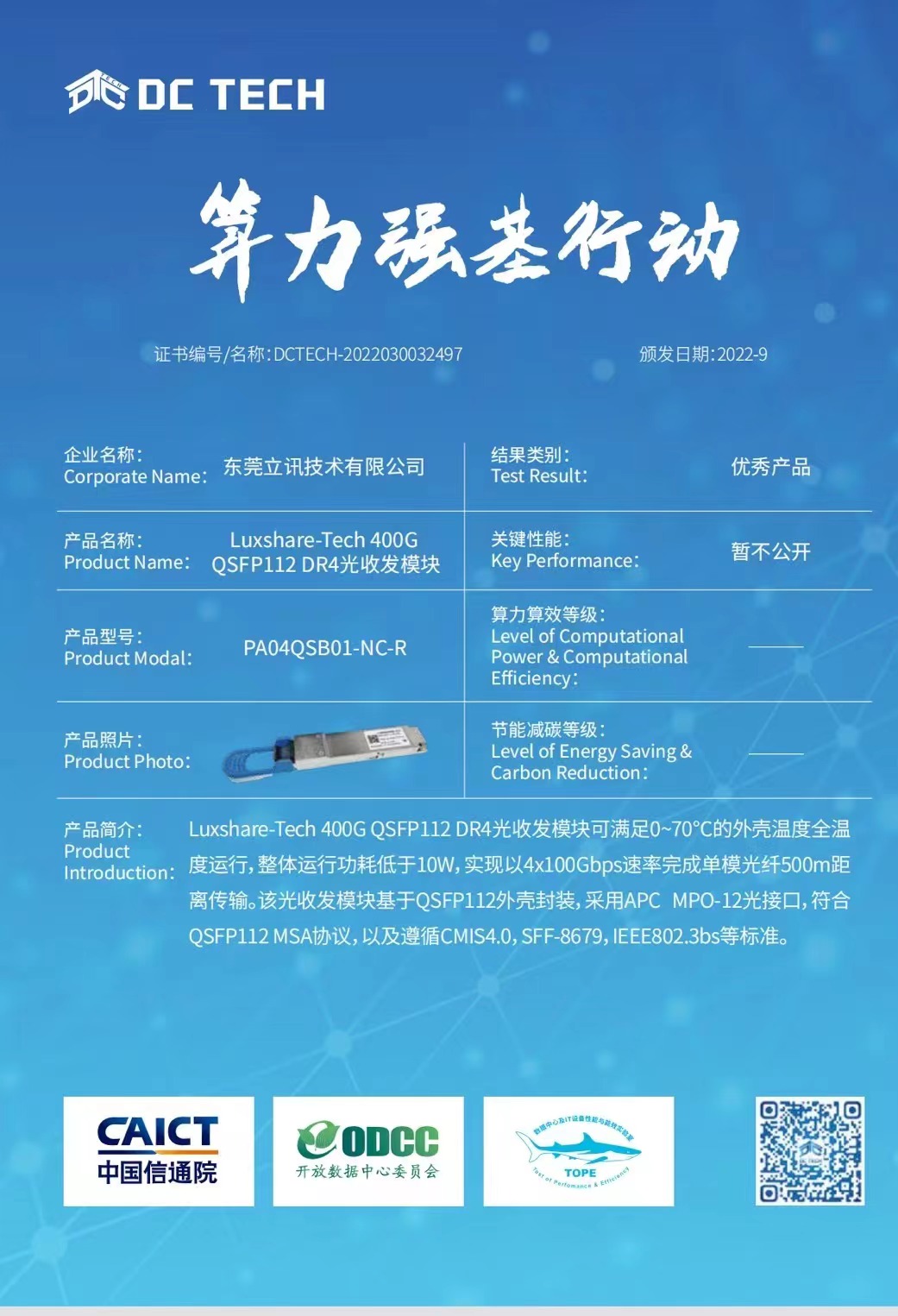 ICC訊 2022年9月5日ODCC(開(kāi)放數(shù)據(jù)中心)2022峰會(huì)在北京國(guó)際會(huì)議中心隆重開(kāi)幕,立訊技術(shù)作為ODCC協(xié)會(huì)成員全程參加了該峰會(huì)。在峰會(huì)期間,立訊技術(shù)的400G QSFP112 DR4光模塊產(chǎn)品喜獲本年度ODCC優(yōu)秀產(chǎn)品獎(jiǎng)。