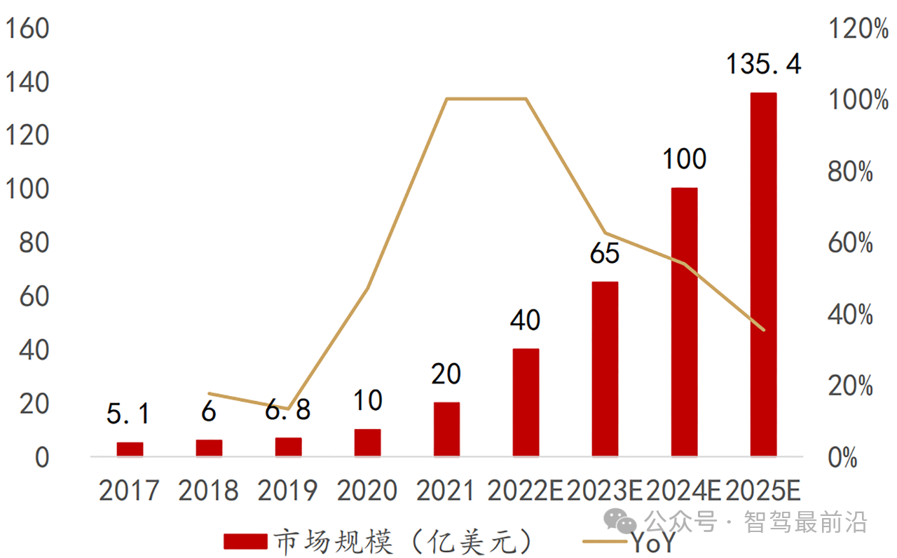 全球激光雷達(dá)市場規(guī)模及預(yù)測(億美元)