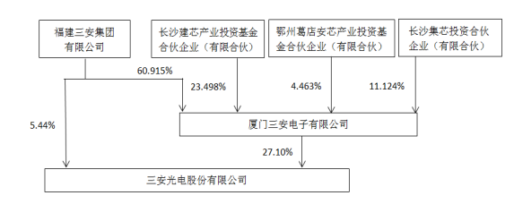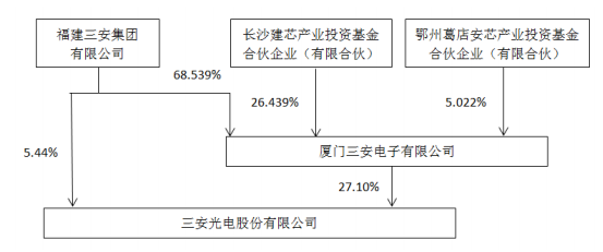 截止本公告日,三安電子持有公司1,213,823,341股股份,占公司總股本的 27.10%,為公司控股股東,同時,三安集團(tuán)持有公司243,618,660股股份,占公司總股本的5.44%,三安集團(tuán)為三安電子的控股股東,本次控股股東股權(quán)結(jié)構(gòu)變動后,本公司控股股東未發(fā)生變動。
