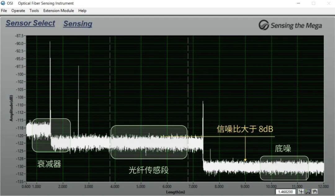 零點(diǎn)位置對應(yīng)設(shè)備DUT口,7.5m以后是無效信號,為設(shè)備底噪,約-130dB;7.5m以前是光纖鏈路的散射信號,衰減器約在1.5m附近,2.5m~7.5m為光纖傳感段。
