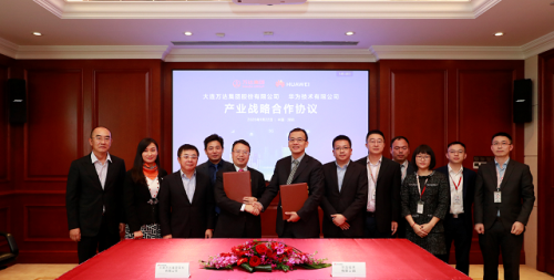 萬達(dá)集團(tuán) CIO 朱戰(zhàn)備(左五)與華為公司戰(zhàn)略部總裁張文林(左六)簽署5G產(chǎn)業(yè)戰(zhàn)略合作協(xié)議